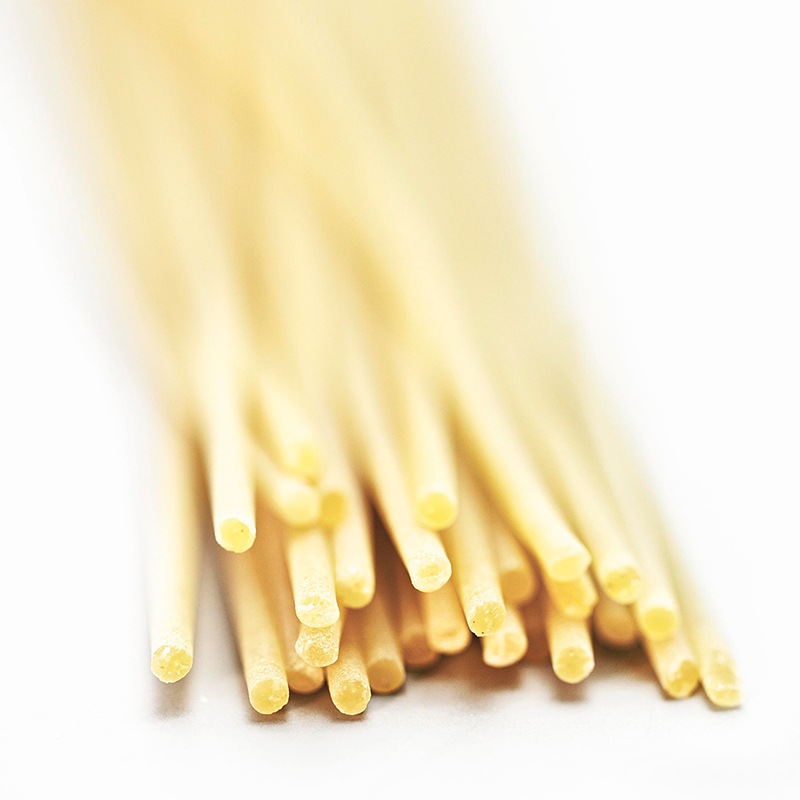 パスタ表面がざらざらに仕上がるブロンズダイス使用。食べ応えのある太めのパスタ。小麦の味わいをしっかりと楽しめます。