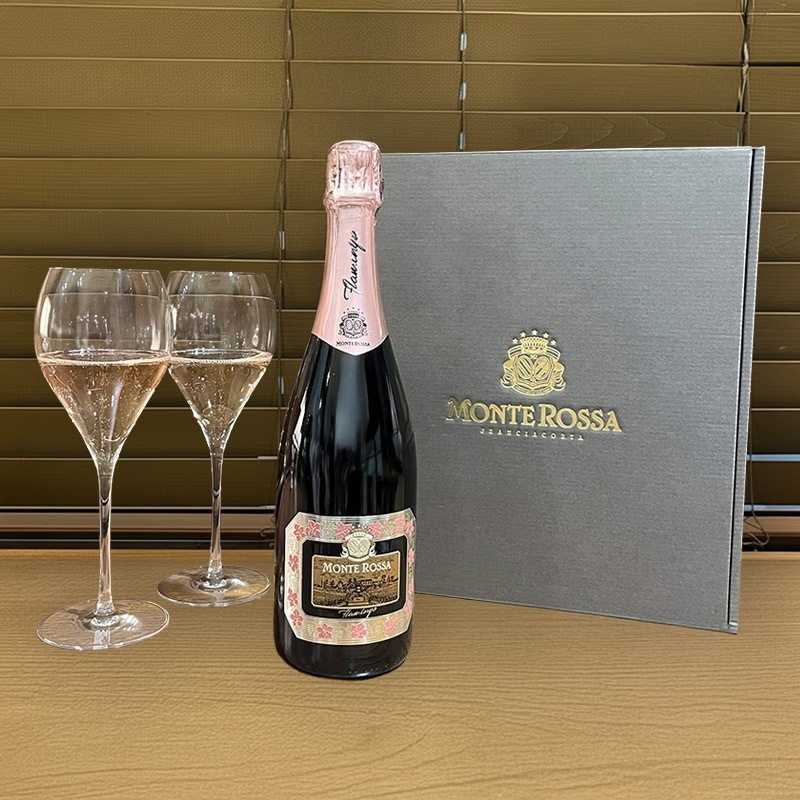 ファッションの中心地ミラノで愛されるフランチャコルタ。グレーのモダンで高級感あふれるオリジナルの化粧箱にフランチャコルタ・ロゼを入れ、フランチャコルタ協会の公式グラス2脚と合わせてお届けいたします。