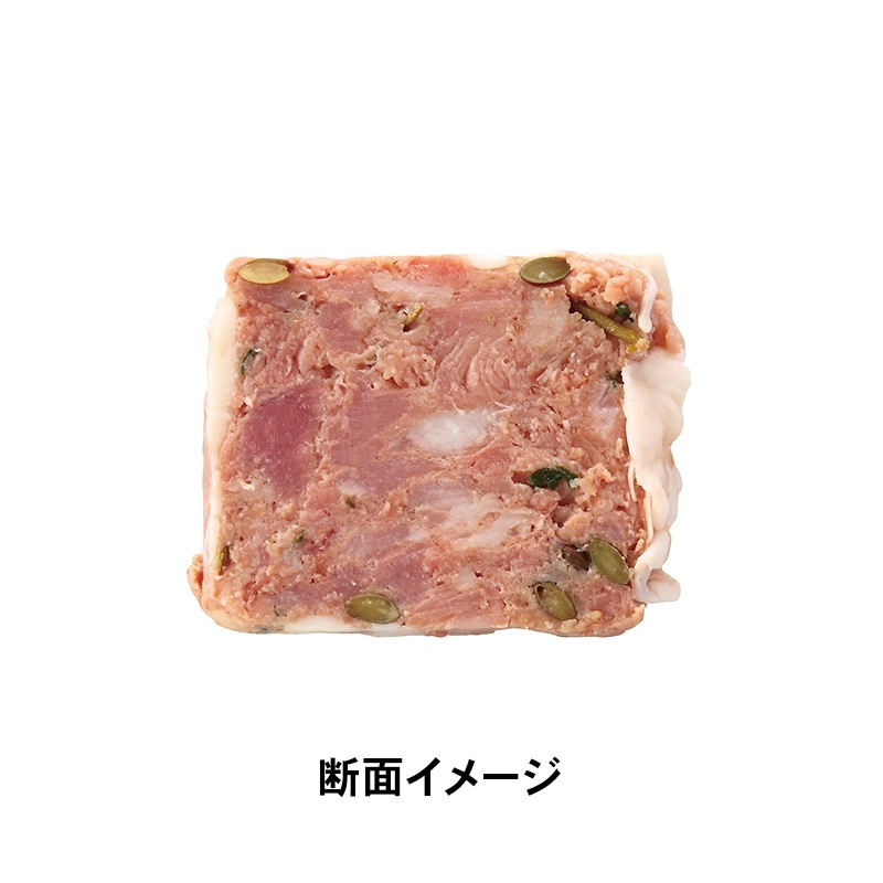 | 原材料 | 仔牛肉(ニュージーランド産)、豚肉、豚脂肪、豚レバー、乾燥緑レンズ豆、オニオンソテー(タマネギ、大豆油)、卵、甘味果実酒、食塩、パセリ、ピスタチオ、ブランデー、香辛料/ポリリン酸Na、酸化防止剤(V.C)、発色剤(亜硝酸Na) |