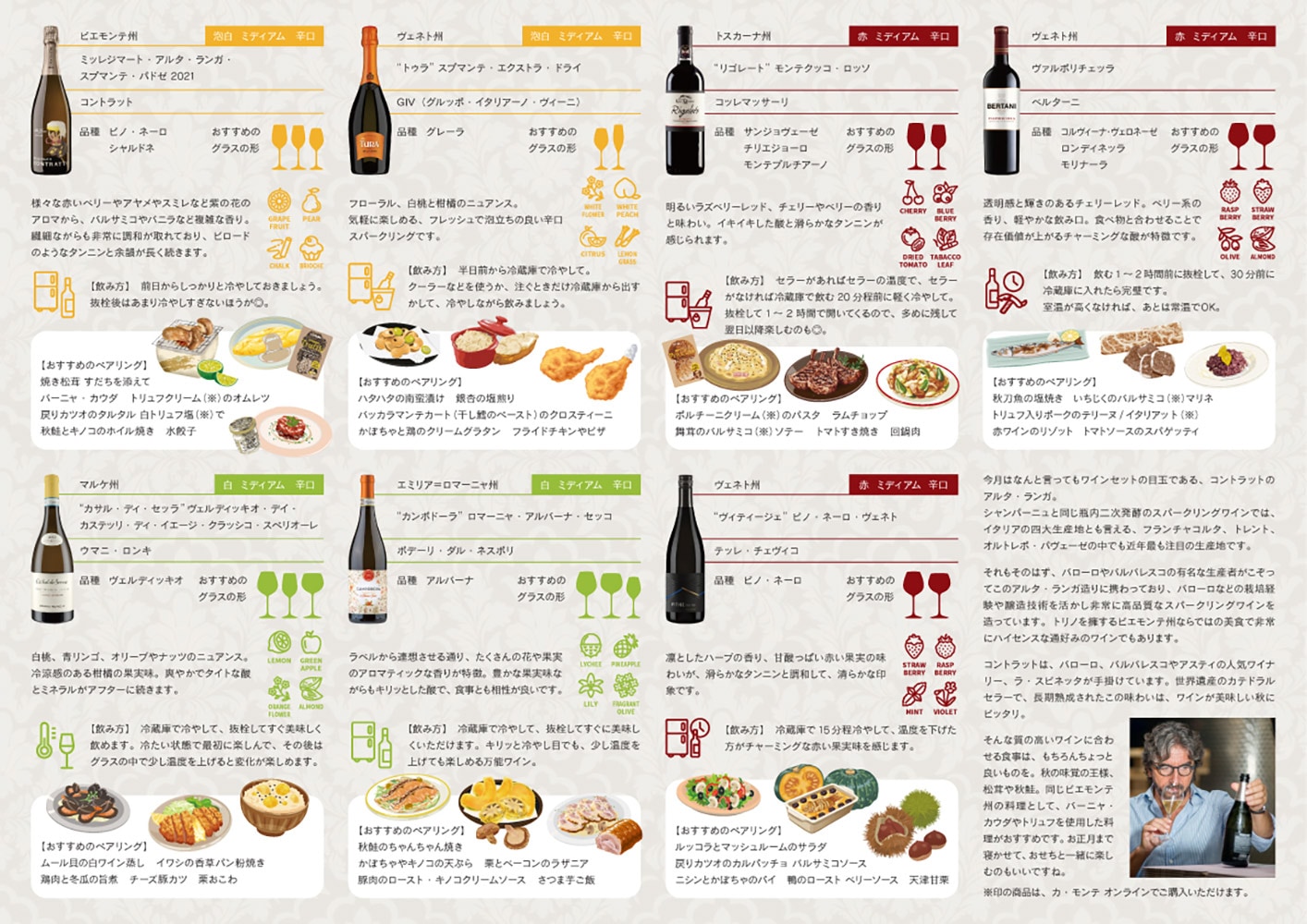 ソムリエによる、ワインの特徴をわかりやすく紹介したシート。また、ワインに合わせたイタリア料理や、今が旬の食材、秋の味覚を用いたメニューとのペアリングもご提案!