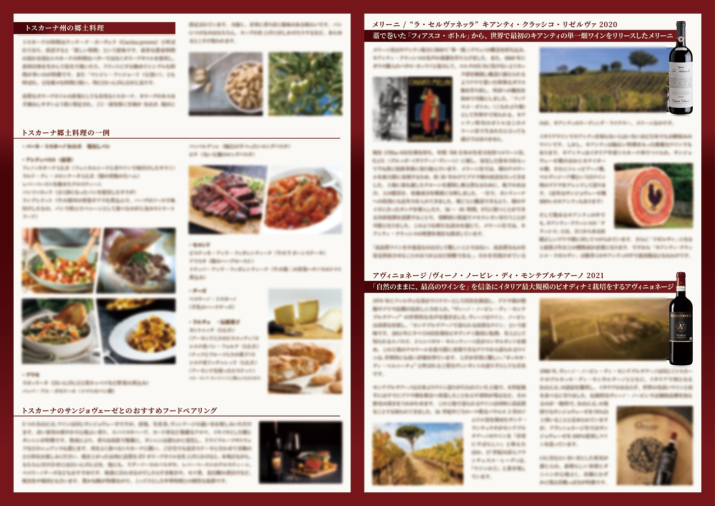 ソムリエによる、ワインの特徴を掘り下げた紹介したシート付き。トスカーナ州の魅力を感じる郷土料理の紹介も。