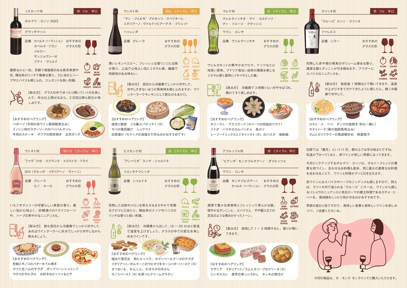 ソムリエがワインの特徴をわかりやすくご紹介。また、ワインに合わせたイタリア料理や、今が旬の食材、晩秋の定番メニューとのペアリングもご提案!