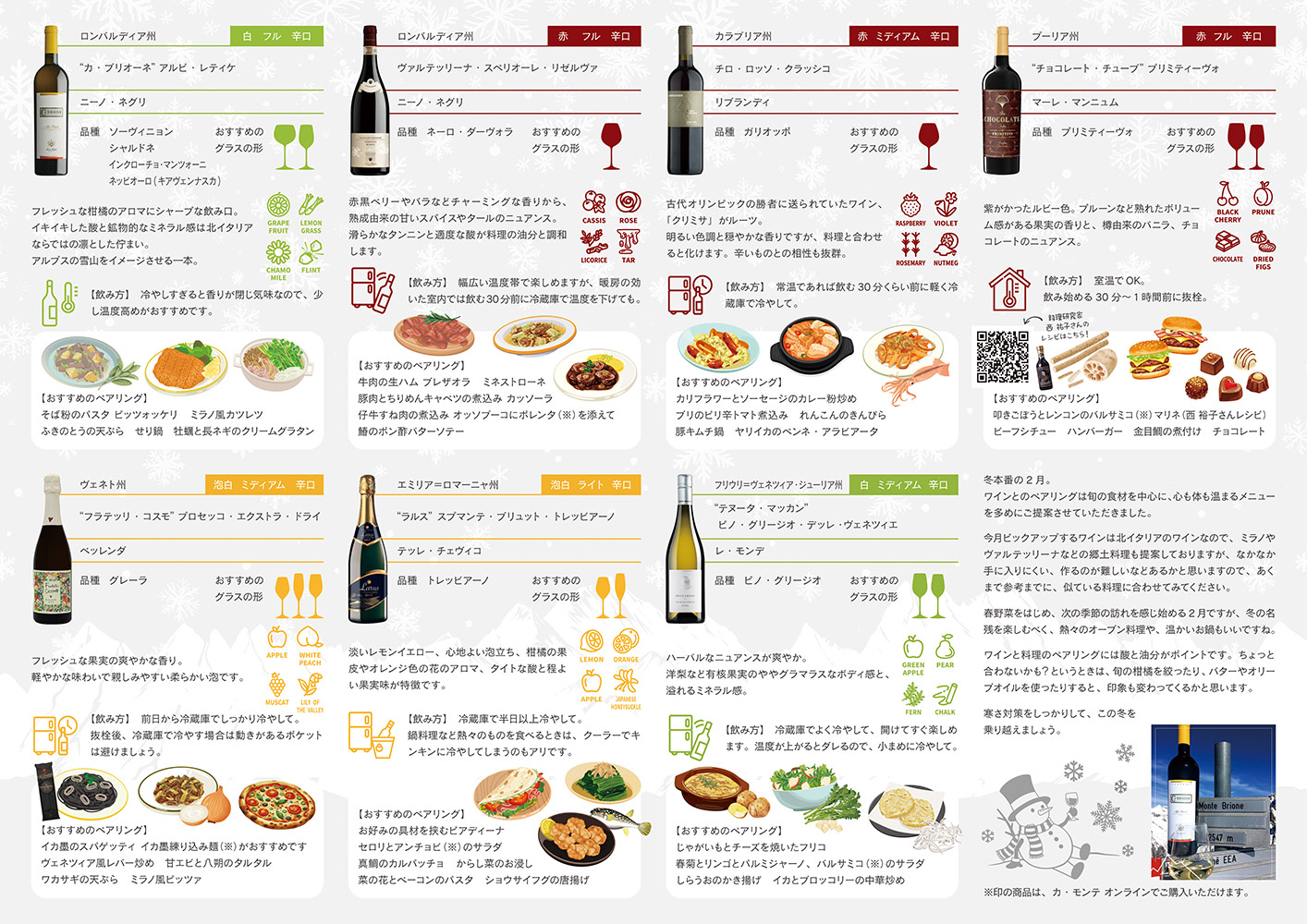 真冬の2月。雪の降り積もるアルプス山脈の麓、北イタリアはヴァルテッリーナから、この冬飲みたい白・赤を今月はピックアップしました。他にも濃い旨赤ワインや、人気のプロセッコなど、寒い日でもホッコリ美味しいワインを厳選!